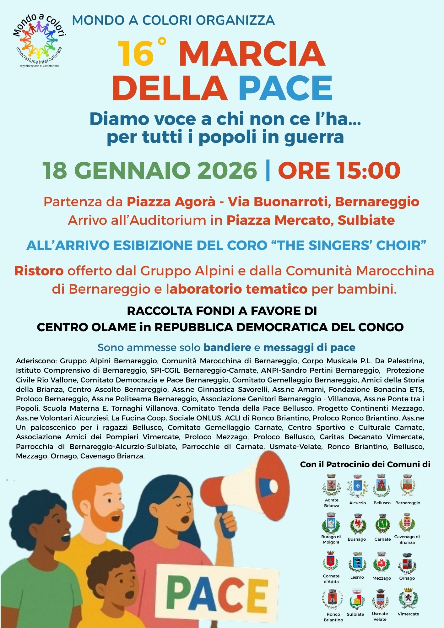 Il Comune di Busnago patrocinia la 16° Marcia della Pace promossa dall' Associazione "Mondo a Colori"